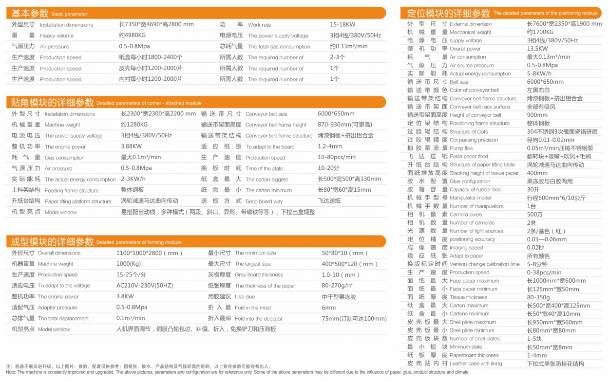 The machine is mainly divided into three parts: positioning module, angle sticking module and forming module. It can realize automatic paper feeding, automatic glue passing, automatic angle sticking, automatic positioning, automatic forming and automatic bubble pressing in the production of all kinds of cartons, wooden boxes and plastic boxes. It can complete a series of technological processes automatically, transfer plates quickly, and produce exquisite boxes. The positioning module includes black-and-white belt, double lens, automatic deviation correction, skin plate lining positioning and five plate positioning. Non adhesive tape slot and double lift paper table of corner module. The intelligent adjustment, automatic locking, servo cam action, no change blade and pressure foam board of the molding module are designed and produced by our company, and have obtained a number of national patents.